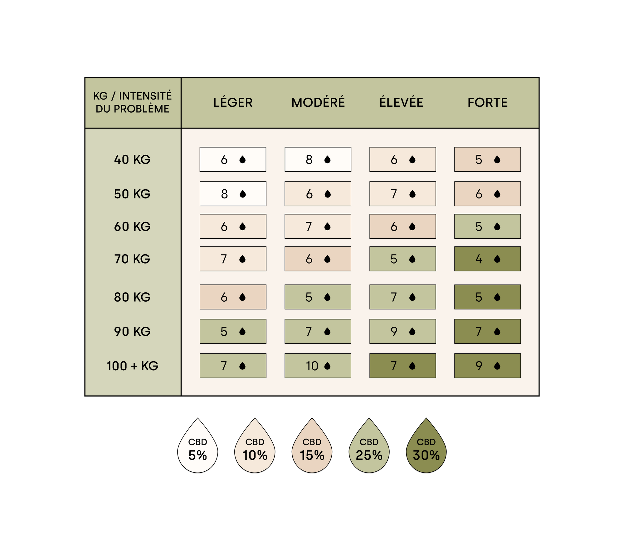 La concentration et le dosage de l'huile de CBD qui te conviennent le mieux dépendent de différents facteurs personnels ainsi que du domaine d'utilisation. Une règle générale pour le début de la prise de CBD est : "start low, go slow ! Il est préférable d'y aller progressivement et d'augmenter la dose petit à petit jusqu'à ce que l'effet souhaité se fasse sentir. Notre tableau de dosage de l'huile de CBD peut te donner un premier point de repère. Le mieux est de verser les gouttes de CBD directement sous la langue à l'aide d'une pipette. Laisse l'huile de CBD agir brièvement. L'huile peut ainsi être absorbée de manière idéale par tes muqueuses et répartie dans le corps.